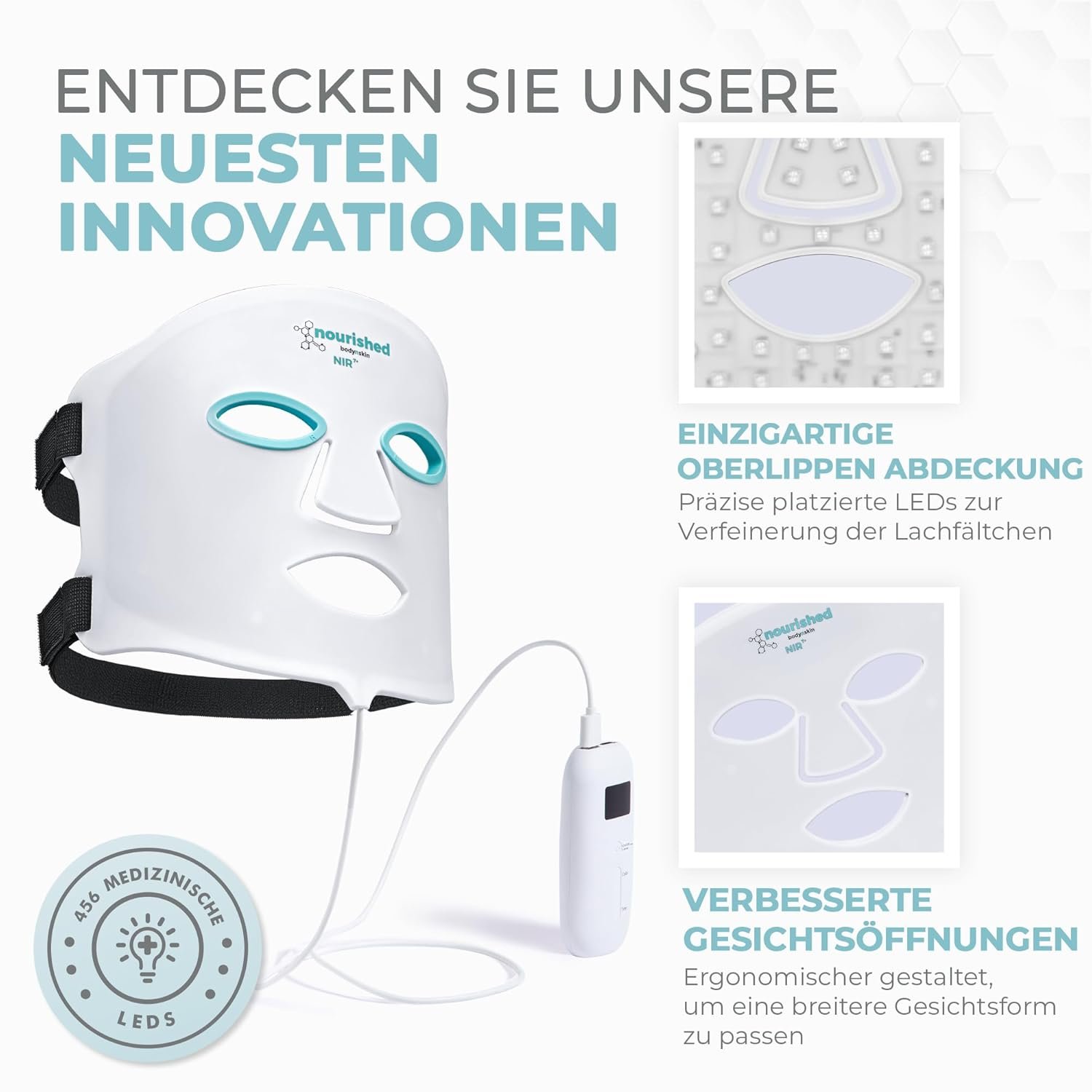 Erleben Sie die nächste Stufe der Heimanwendung mit einer beeindruckenden Dichte von 456 hochpräzisen LEDs. Die Nourished Bodynskin LED-Maske kombiniert sieben klinisch erprobte Lichtwellenlängen mit unsichtbarem Nahinfrarot (NIR), um Ihre Haut nicht nur oberflächlich, sondern in der Tiefe zu regenerieren.