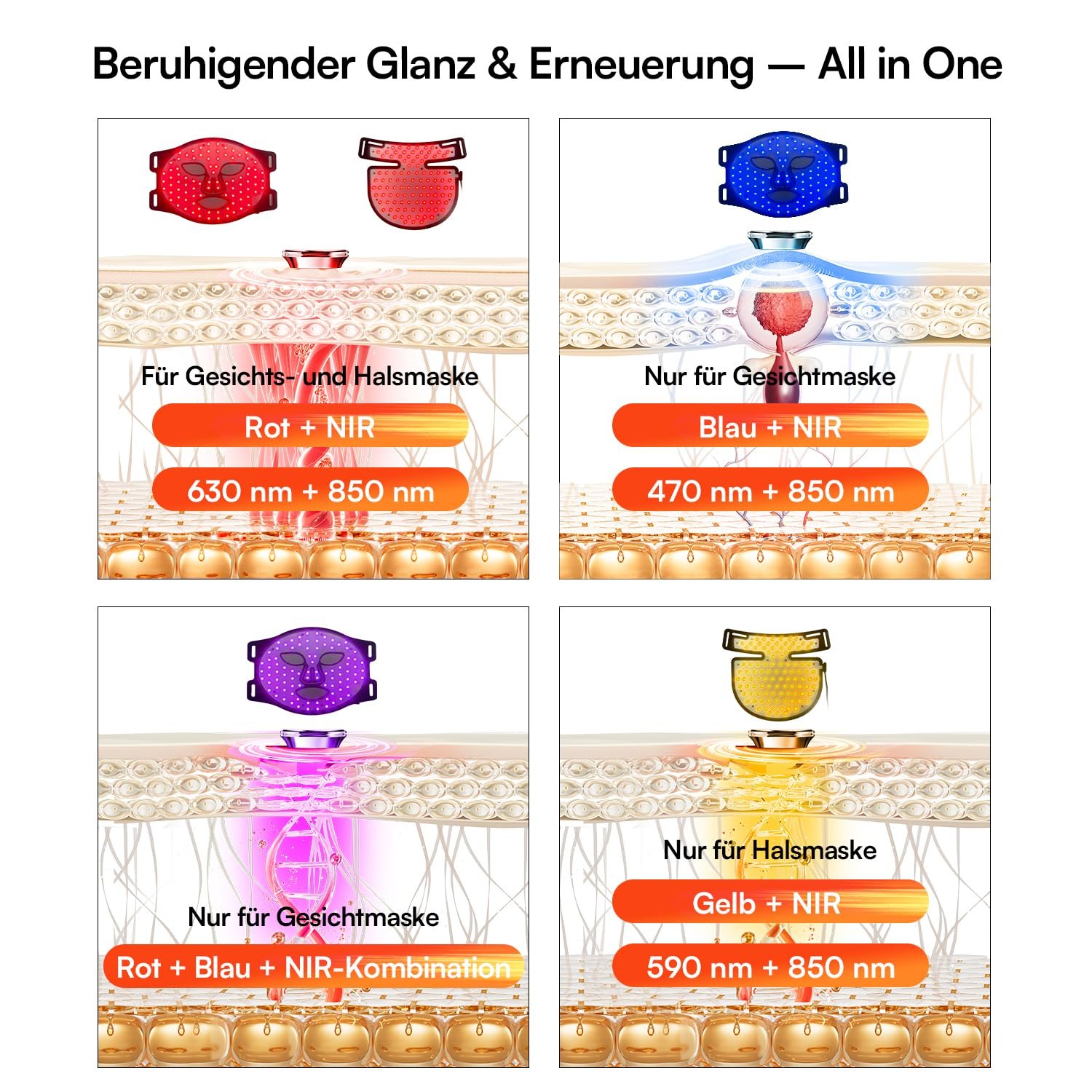 Gelb (590 nm): Verfeinert die Hautstruktur und lindert Rötungen.