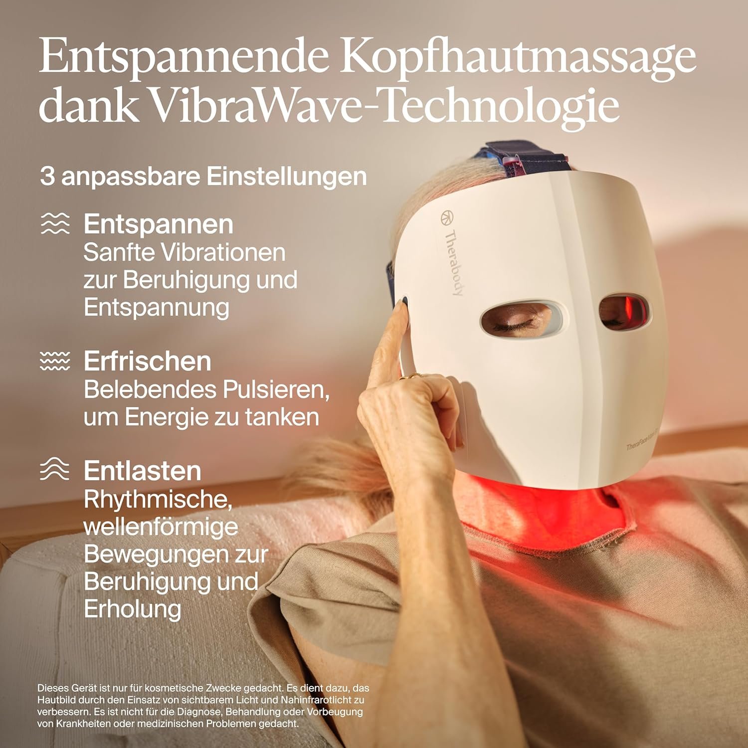 VibraWave™ Kopfmassage: Einzigartig auf dem Markt – genießen Sie während der Lichttherapie eine sanfte Kopfhautmassage. Wählen Sie aus drei Modi (Relax, Refresh, Relieve), um Stress abzubauen und Verspannungen zu lösen.