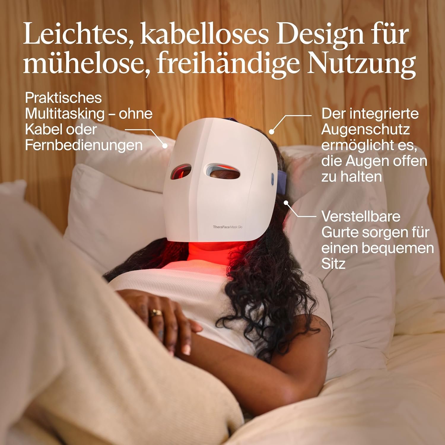 Kabelloser High-End Komfort: Das ultraleichte Design „schwebt“ förmlich über der Haut. Dank der atmungsaktiven Passform und des integrierten Augenschutzes können Sie während der Anwendung problemlos lesen oder entspannen – ganz ohne störende Kabel oder Fernbedienungen.